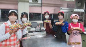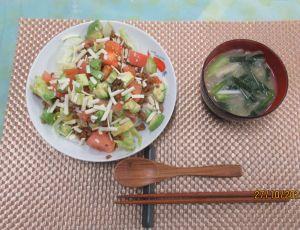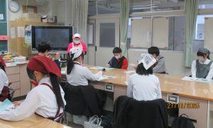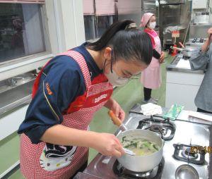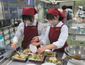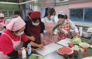 10月27日(月)本校の調理室でつがる市食生活改善推進員による料理講習会がありました。「全世代に広げよう健康寿命延伸プロジェクト」のテーマのもと若者世代は食事バランスの偏りややせ、食塩摂取量や野菜摂取の課題があるため、家庭クラブ員(15名)を対象に実施しました。まず、つがる市食生活改善推進員さんより健康的な食生活について講義をしてもらい、実習に入りました。メニューは「タコライス、にらともやしのごまみそ汁」です。みそ汁の塩分濃度は0.8%で、実際に計測しました。おだしがきいてとてもおいしいく出来上がりました。放課後の活動のため、タコライスは持ち帰りとなりました。班ごとに指導していただいた食生活改善推進員さんと調理技術や学校生活などについて楽しくコミュニケーションをとりながら料理を完成させました。生徒の感想の中には「すぐ家族に作って食べさせたい」「健康のための食事作りに関心をもった」「将来の一人暮らしの生活に役立てたい」などがありました。