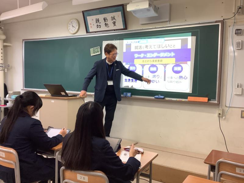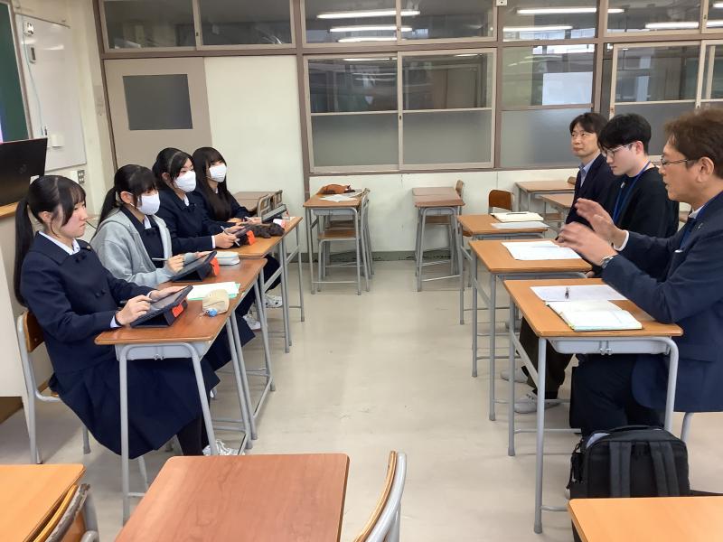 10月21日(火)、総合的な探究の時間を利用して、若者の早期離職問題について探究している班が、一般企業の方とのディスカッションを実施しました。今回探究活動に協力していただきました企業は「株式会社DRAGON AGENCY」という、IT関係の企業です。生徒たちからの質問に、若者の早期離職の現状について企業目線からの意見をいただいたことで、探究をより深めることができました。また、就職活動成功のためのポイントなどのアドバイスもいただきました。講師の方々の就職活動に関するエピソードに、生徒たちは興味深く耳を傾けていました。